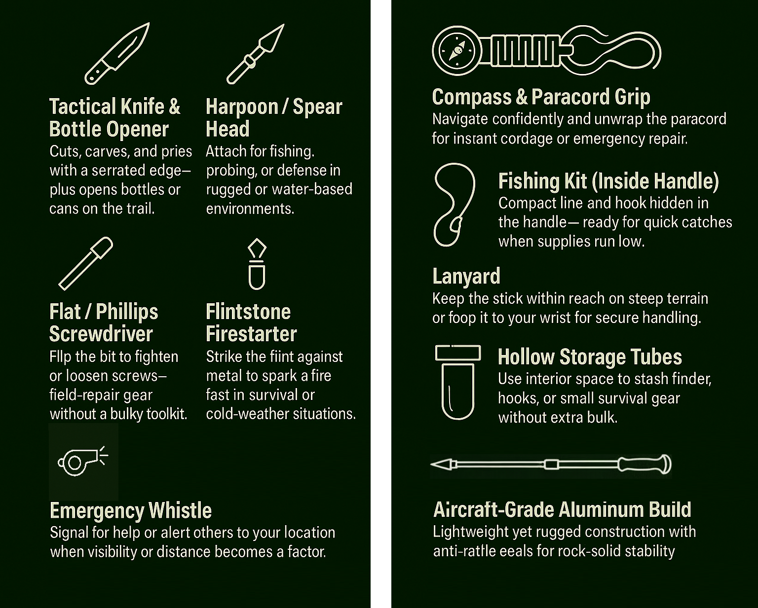 - 🪝 Spear Head & Harpoon – Attach for fishing, probing, or defense in rugged or water-based environments.